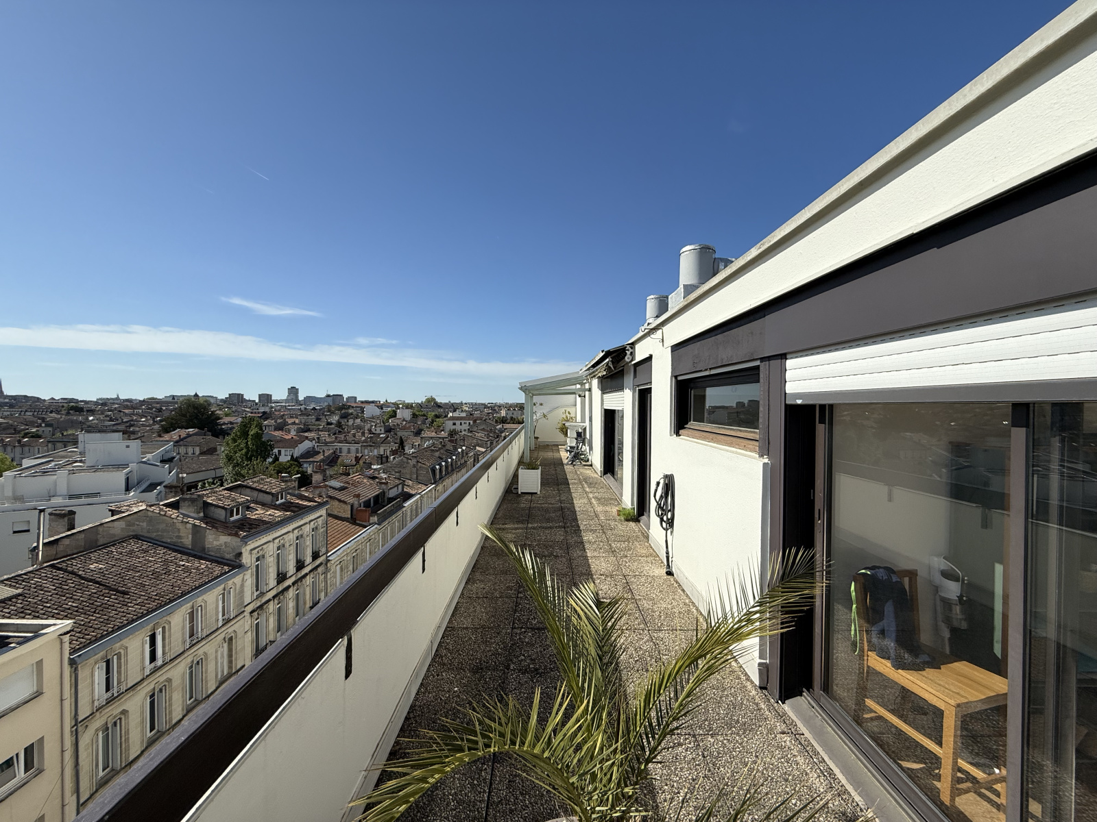 Une grande terrasse de 45m2 exposée plein Est avec une vue sur tout Bordeaux complète ce bien, mais vous trouverez également deux balcons exposée Ouest en plus de la terrasse, l'un donnant sur le salon, l'autre sur une chambre.