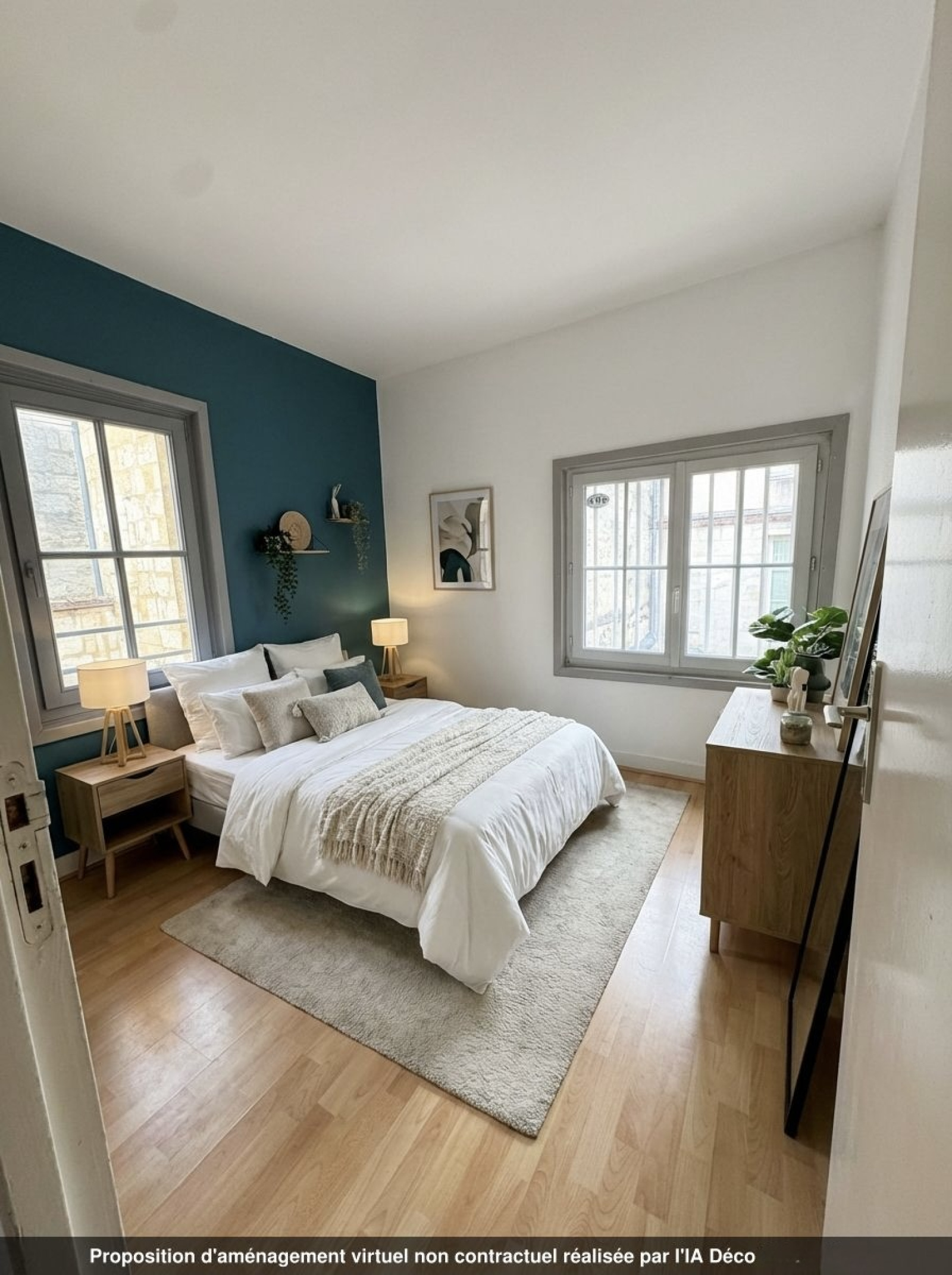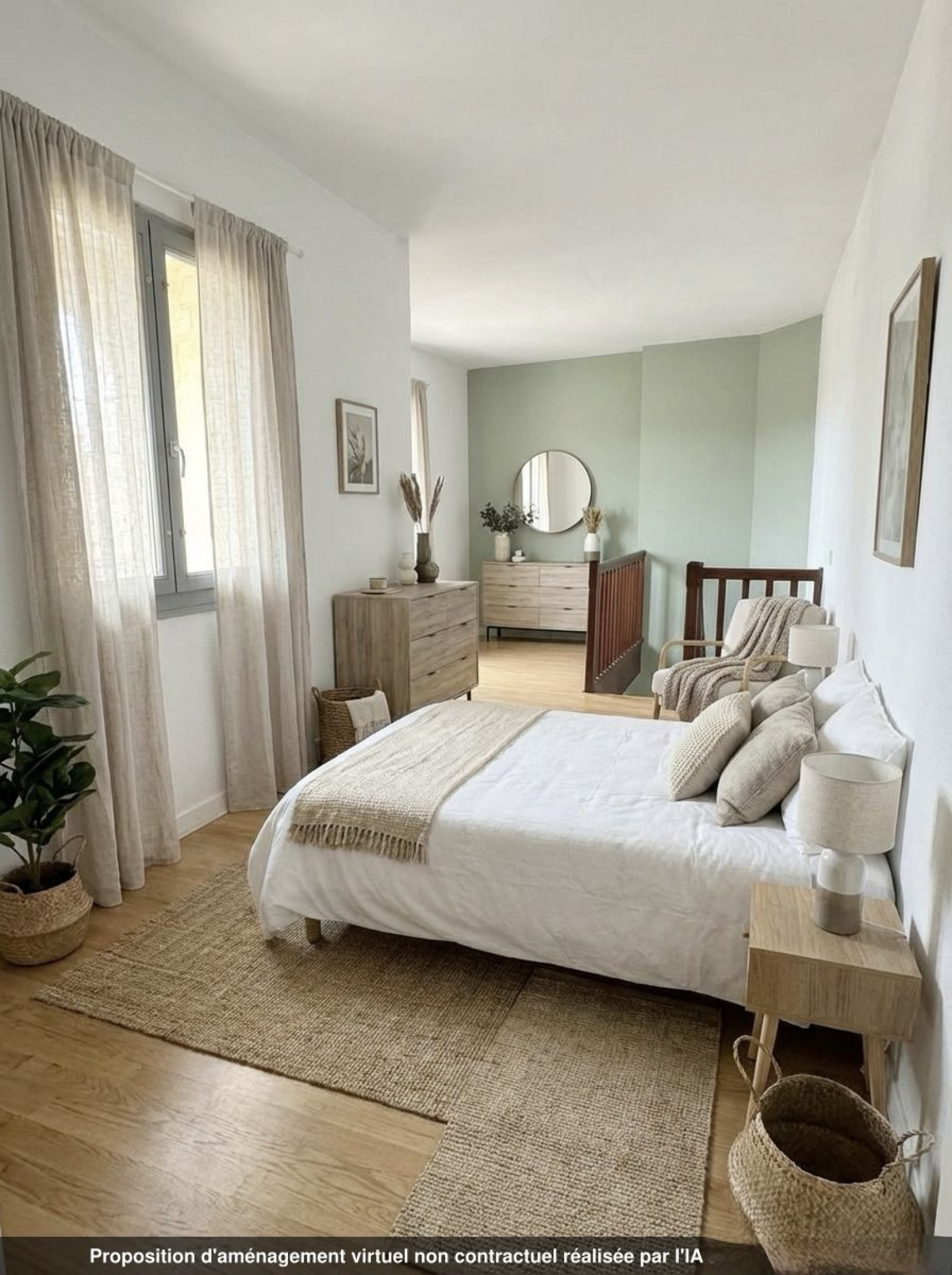 À l’étage, une seconde chambre spacieuse de 19 m², offrant de beaux volumes.
