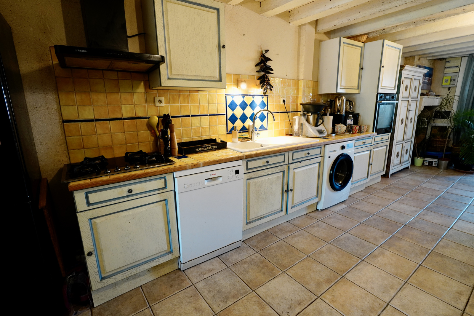La pièce de vie d'environ 40 m2 avec sa cheminée d'époque ouvre sur une cuisine indépendante et spacieuse donnant sur une véranda chauffée.