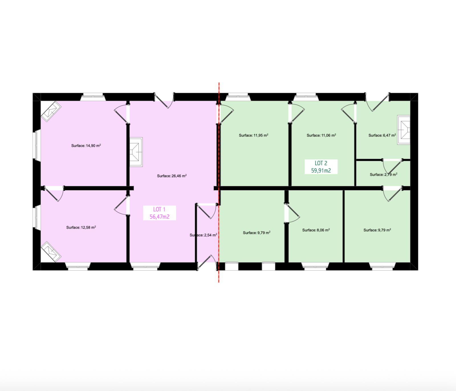 Chaque lot fait une surface d'environ 60m2, la maison était initialement entièrement de plain-pied et repose sur une vaste parcelle de plus de 1000 m².