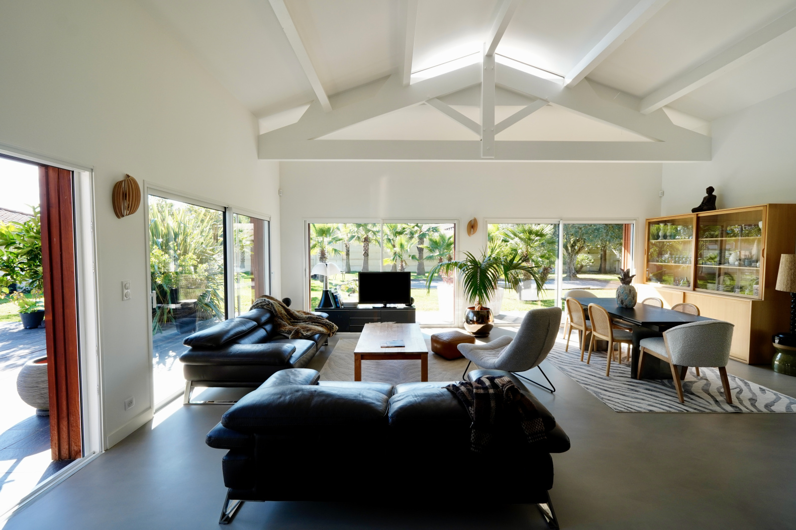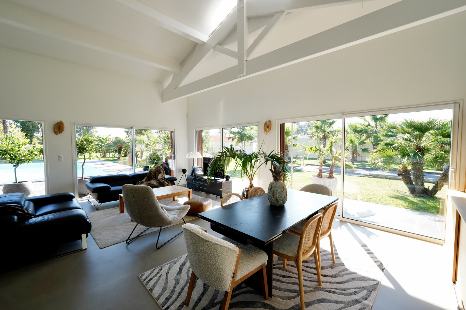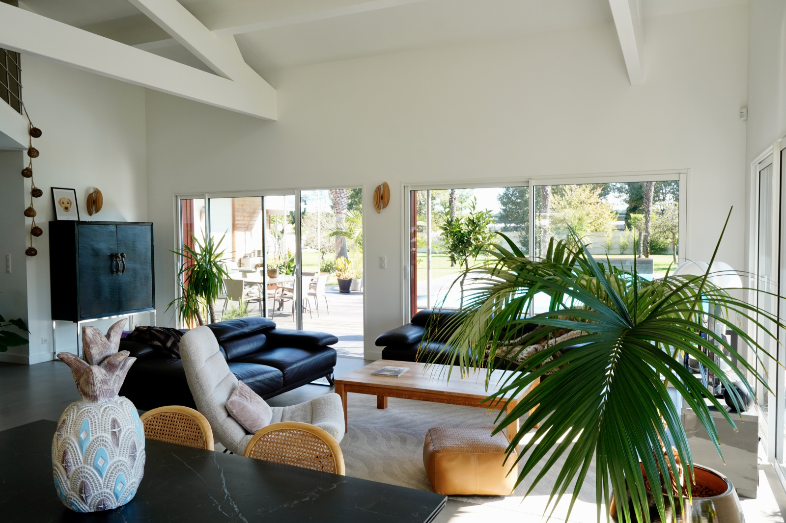 De près de 70 m², cette véritable pièce de vie s’ouvre sur l’extérieur grâce à de grandes baies vitrées offrant une vue imprenable sur le jardin arboré et la piscine.