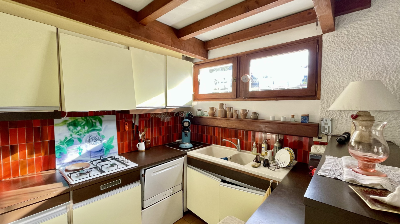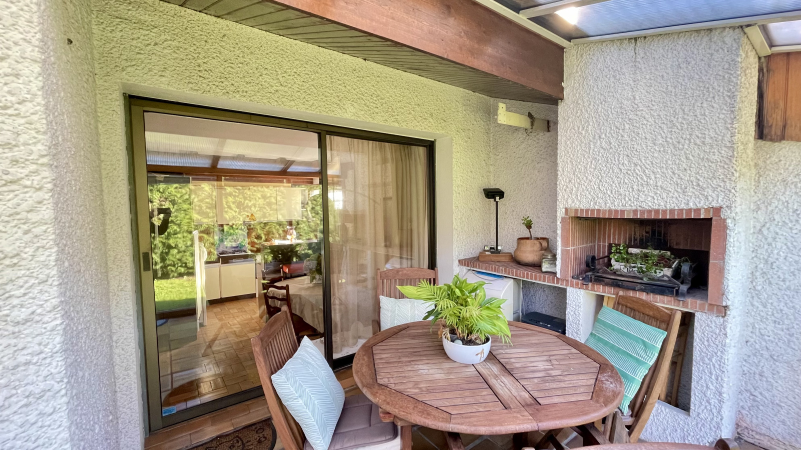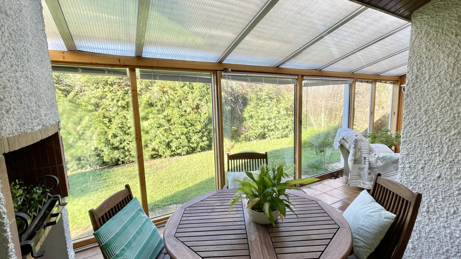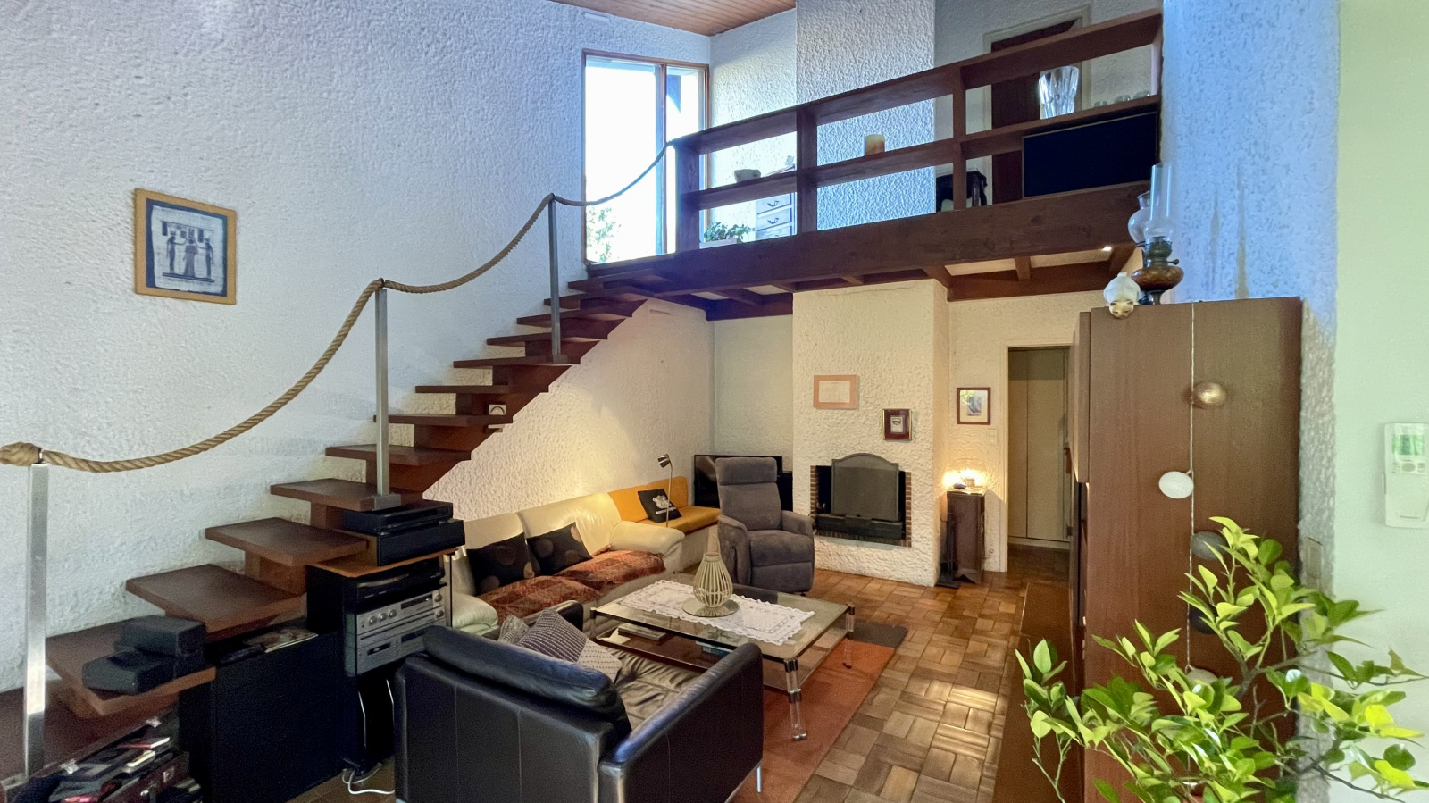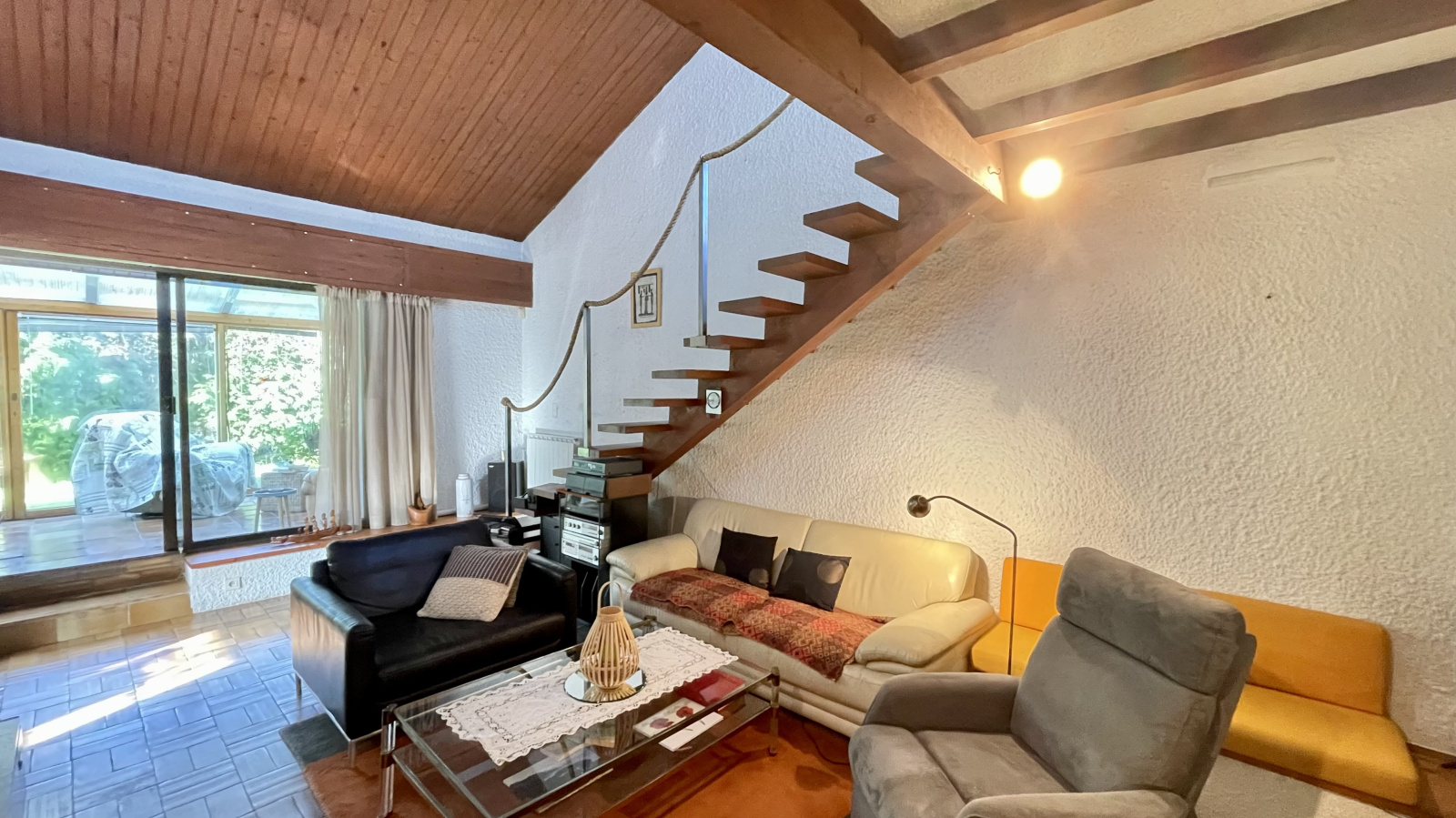 La partie rez-de-chaussée est composée d'un grand salon séjour cathédrale avec cheminée avec une partie cuisine ouverte aménagée et équipée, ouvrant directement sur la grande veranda exposée plein Ouest.
