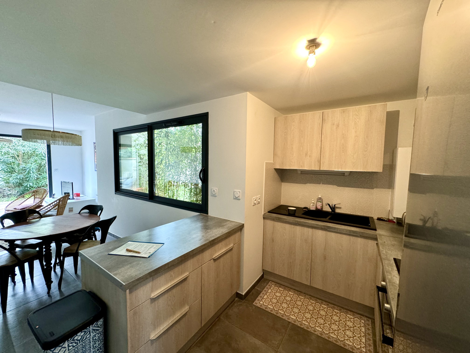 Cette maison d'une surface d'environ 90m2 est composée au rez-de-chaussée, d'une grande pièce de vie avec cuisine équipée ouverte donnant sur le salon salle à manger ouvrant sur la terrasse avec son jacuzzi et son grand jardin.