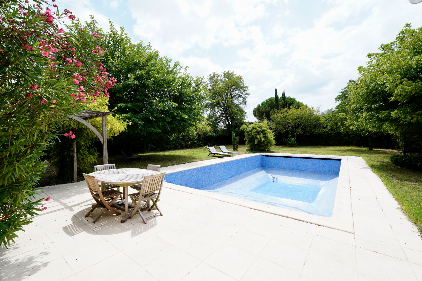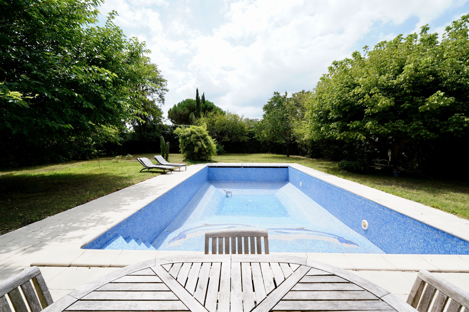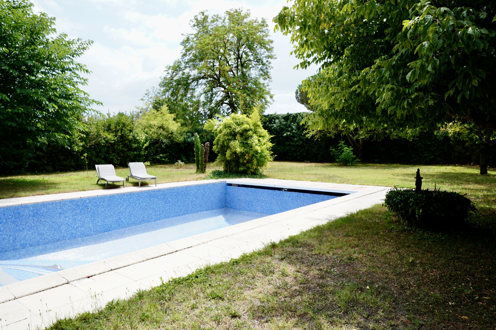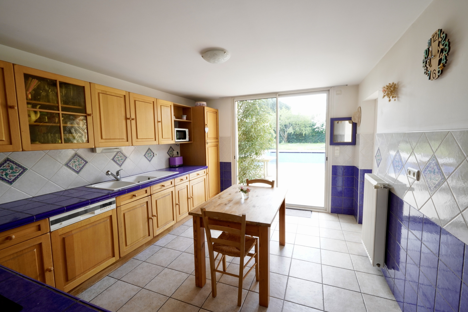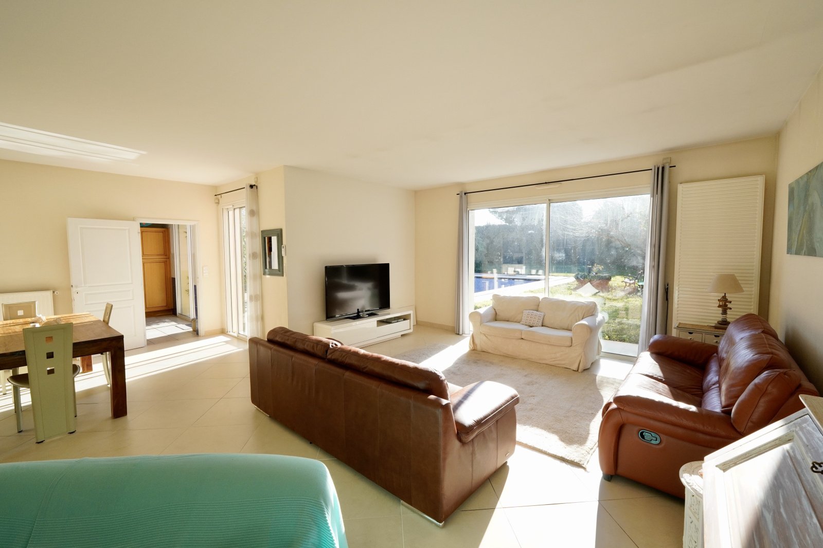 La partie rez-de-chaussée est composée d'un grand salon séjour avec cheminée et ouvrant sur la terrasse et le jardin avec piscine exposée Sud/Ouest.