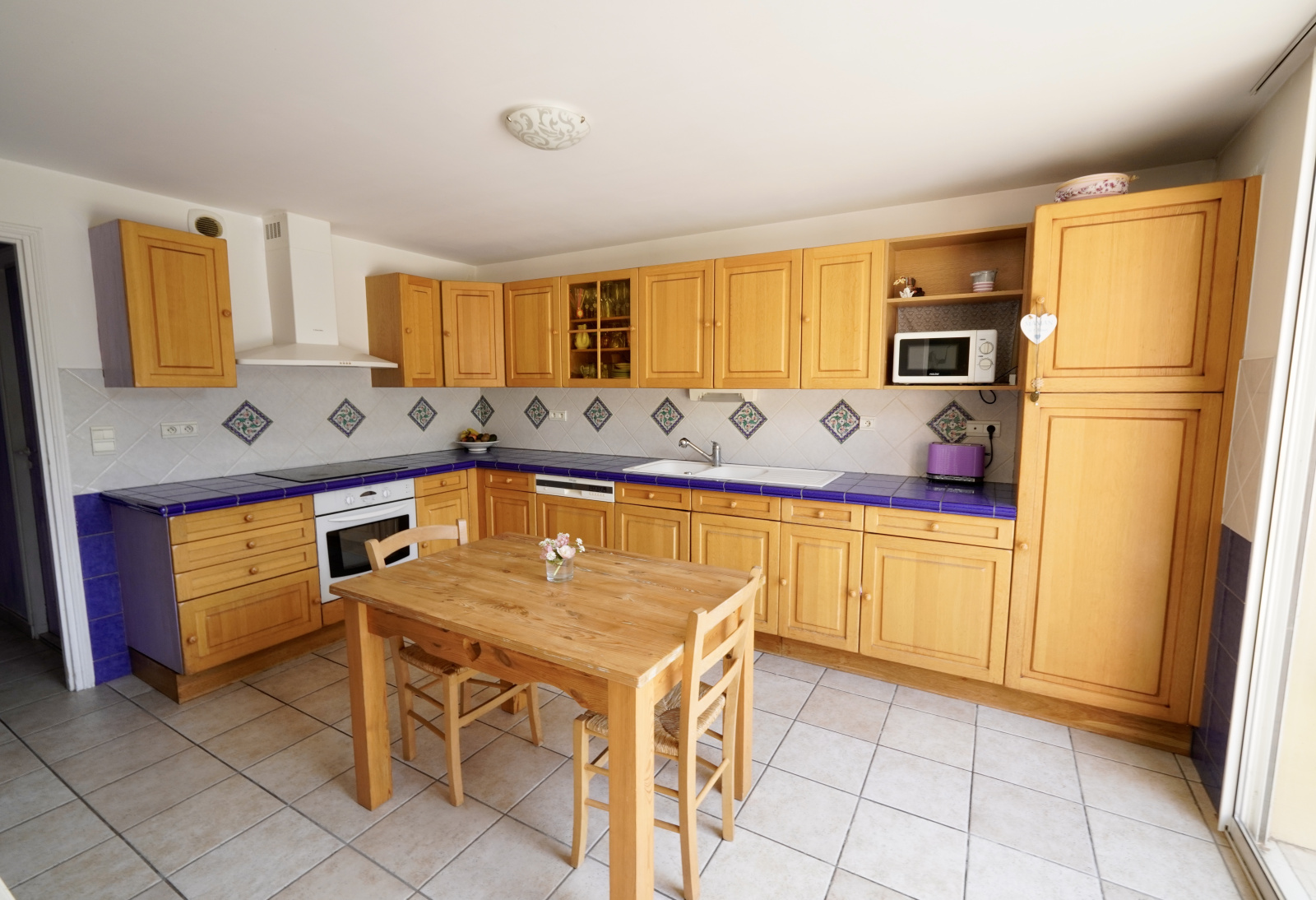 Une cuisine séparée, équipée, avec buanderie, un espace bureau spacieux et beaucoup d'espace de rangements.