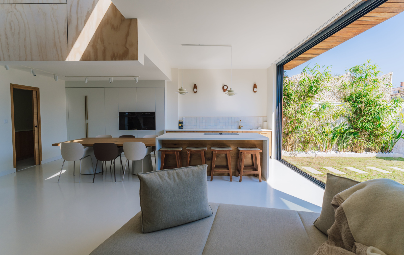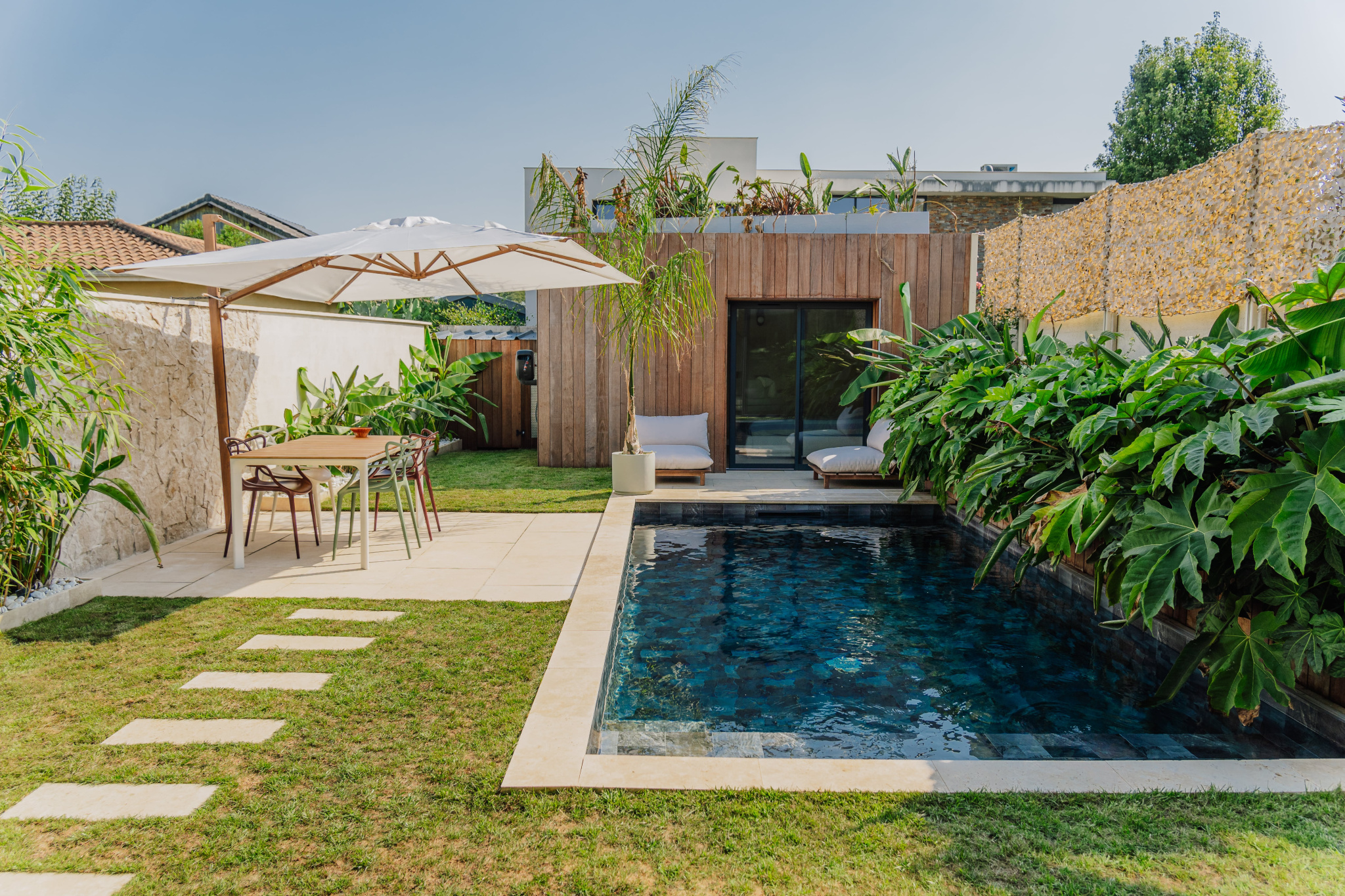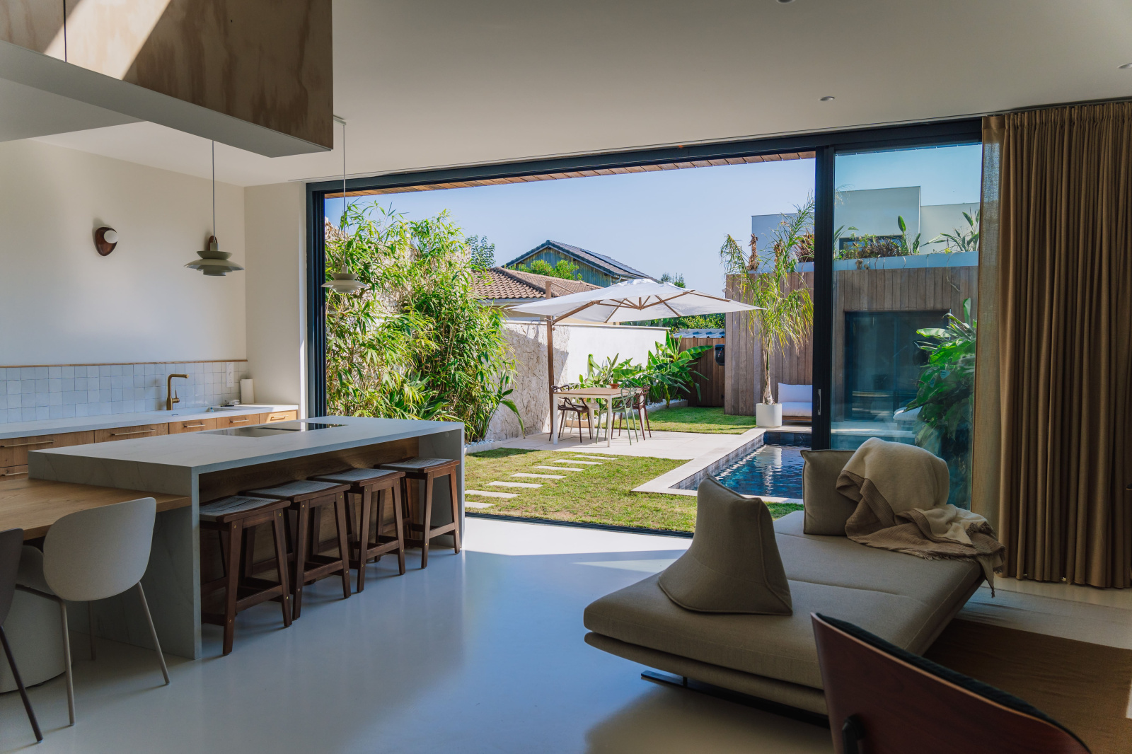La pièce de vie extrêmement lumineuse donne avec de grandes baies vitrées panoramiques de 8M sur le jardin avec sa piscine chauffée au sel exposée plein Sud.