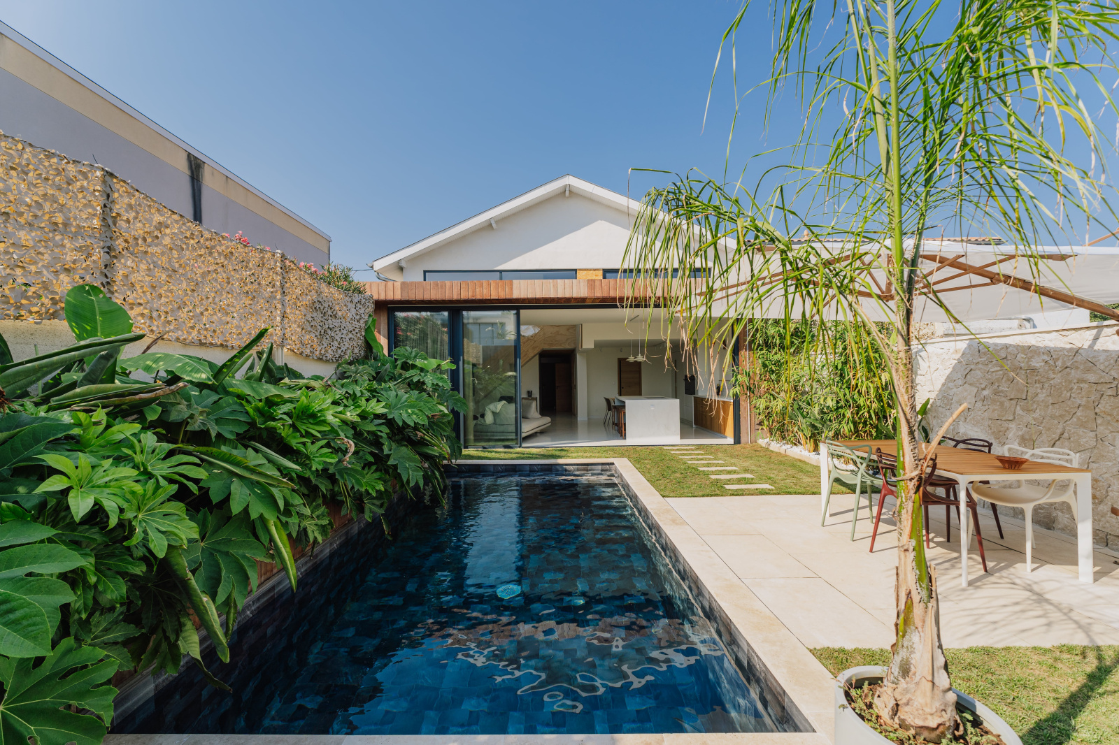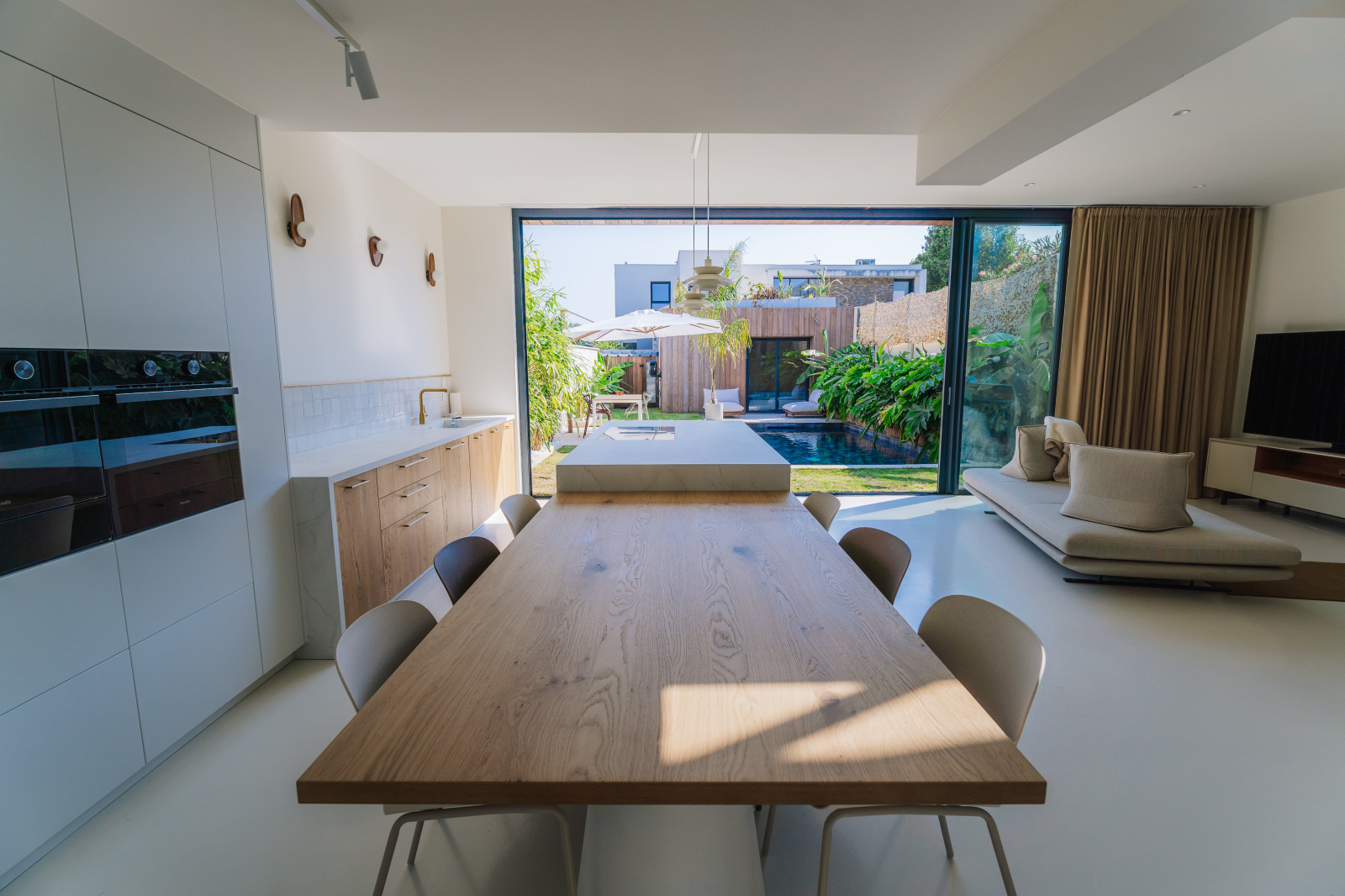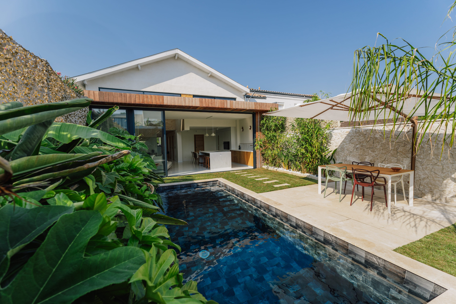 La pièce de vie extrêmement lumineuse donne avec de grandes baies vitrées panoramiques de 8M sur le jardin avec sa piscine chauffée au sel exposée plein Sud.