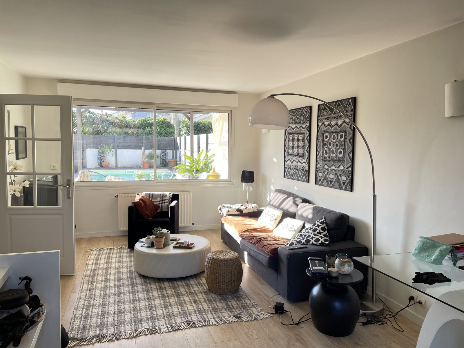 Le rez-de-chaussée très lumineux est composé d'une entrée, d'un séjour traversant ouvert sur le jardin d'un coté avec piscine exposé plein sud et le second jardin avec terrasse de l'autre, ainsi qu'une cuisine séparée.